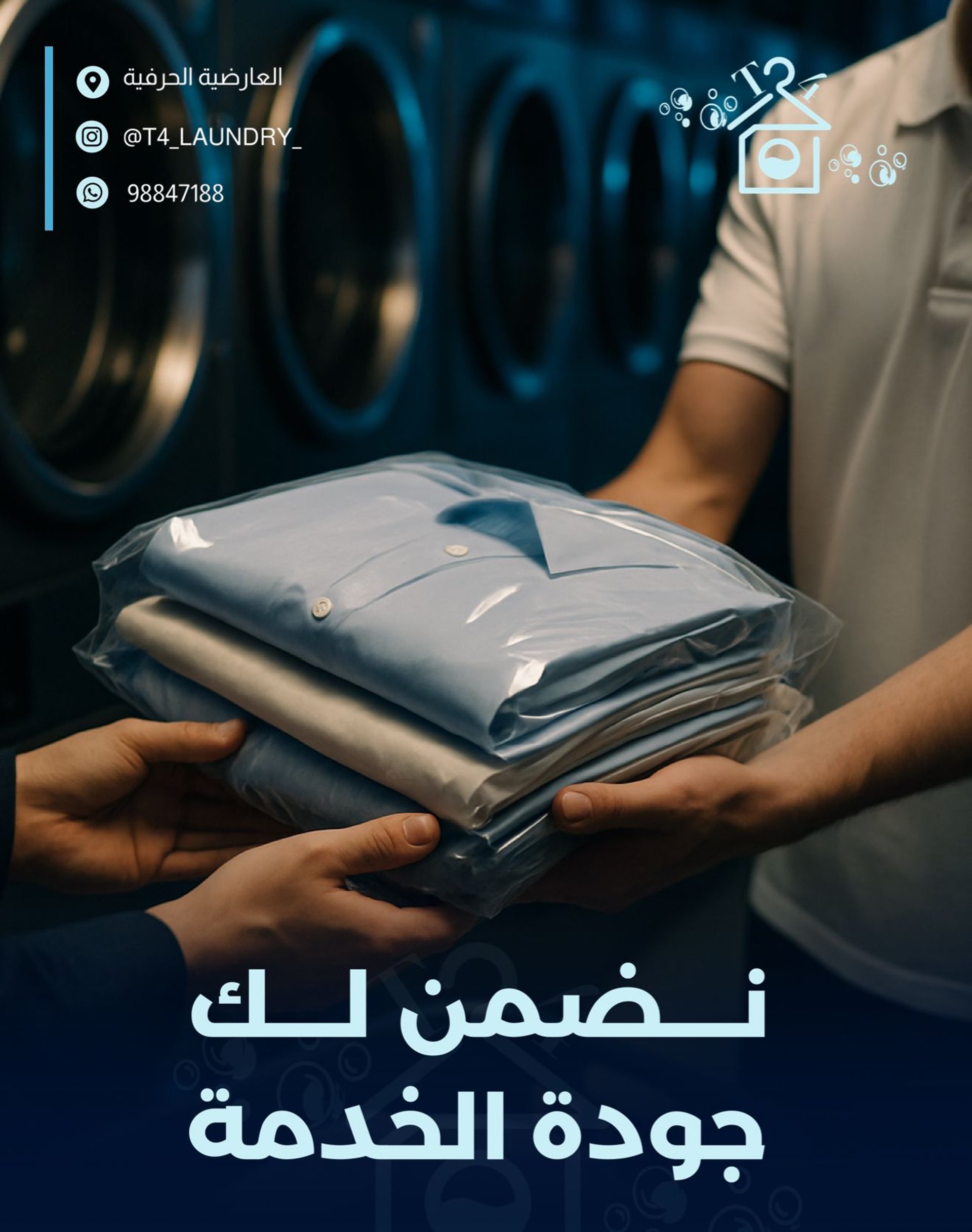 مصبغة تي فور T4 هي وجهتك المثالية لخدمة غسيل الملابس حيث نتميز بتقديم جودة عالية، وسرعة في الإنجاز، واهتمام بالغ بالتفاصيل.